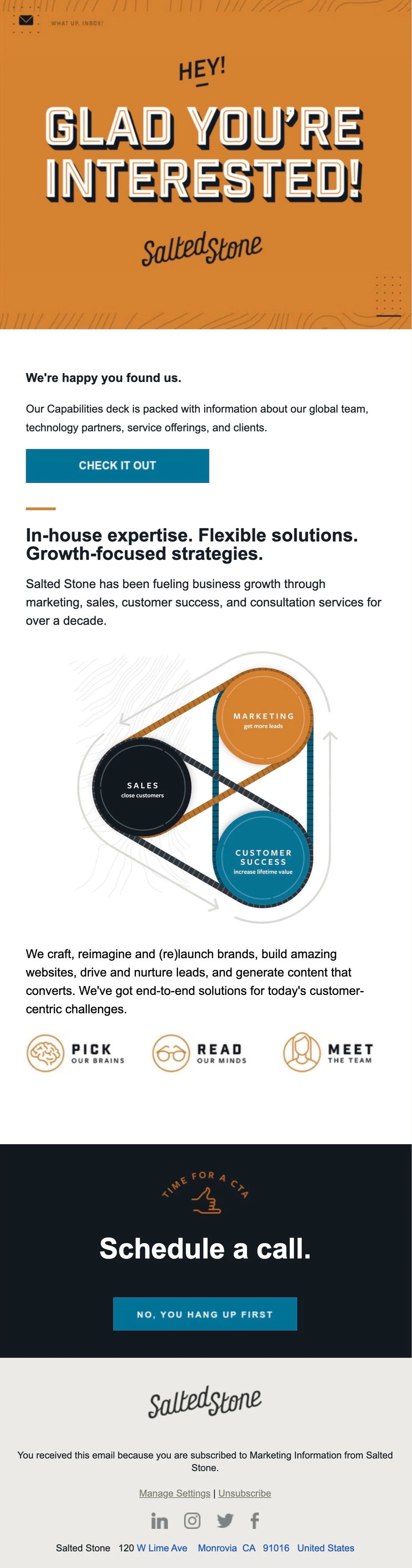 Content: Nurture emails in a “drip” campaign for MQLs, sample monthly newsletter emails to customers and followers.